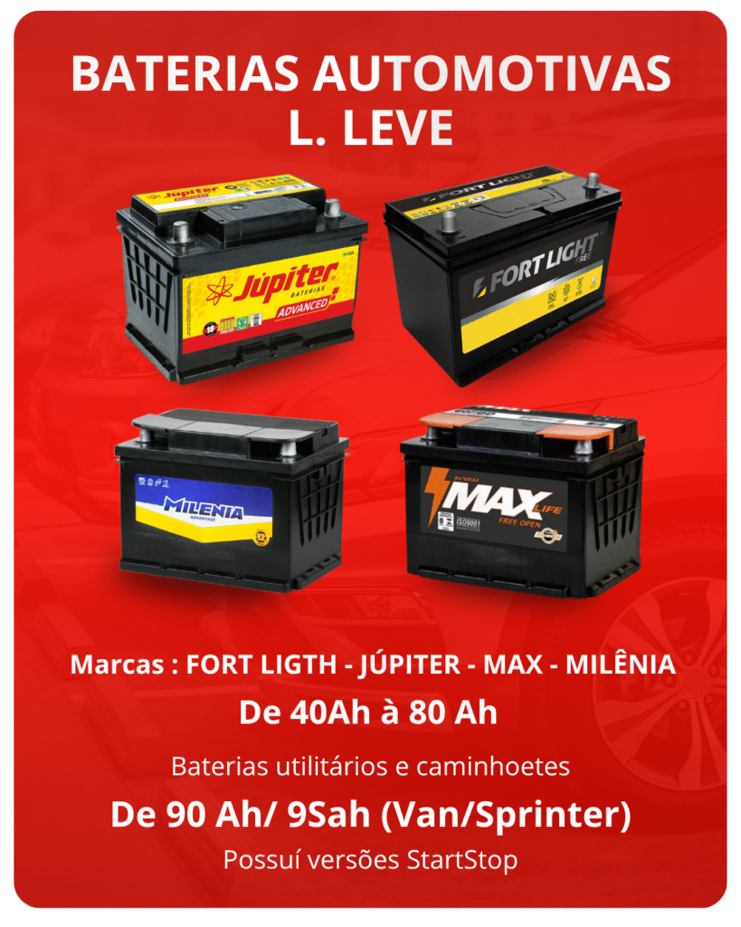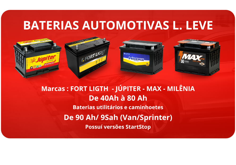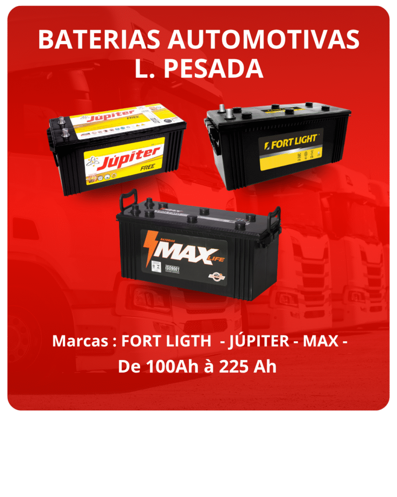 Na linha Automotiva representamos as marcas Fort Light Baterias, Júpiter Baterias, Max Baterias e Milênia Baterias. As marcas Fort Light, Júpiter e Max também atendem linha pesada (ônibus, caminhão, trator).