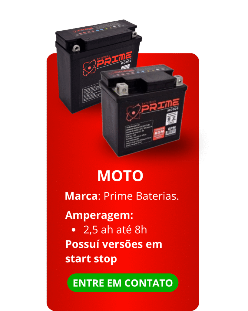 Na linha de motocicletas representamos a marca Prime Baterias. As marcas por nós representadas perseguem a excelência, o principal objetivo é fornecer produtos de qualidade cuidando, sobretudo, das questões voltadas à segurança de seus colaboradores, consumidores e do meio ambiente.